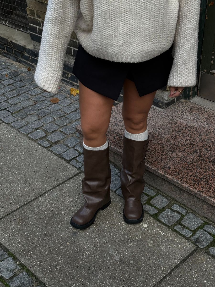 Our Ellie PU boots that come in 2 different colors. The boots go to just below the knee and have 3 buckles on the outside 🤎. The perfect tall boots without heels that can even be used as a pair of stylish rubber boots due to the water-repellent material. Our Ellie boots are the coolest biker boots.