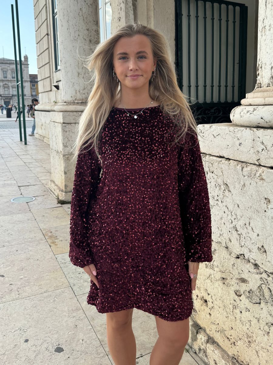 Our Aija bow dress in dark red is filled with sparkling details that make it a sure hit for Christmas, New Year's Eve, and other festive occasions. The thigh-length dress has a beautiful black bow at the back, which adds an elegant and unique look. With its sparkling surface and fine details, it is perfect for creating a festive and colorful look that stands out 🥂