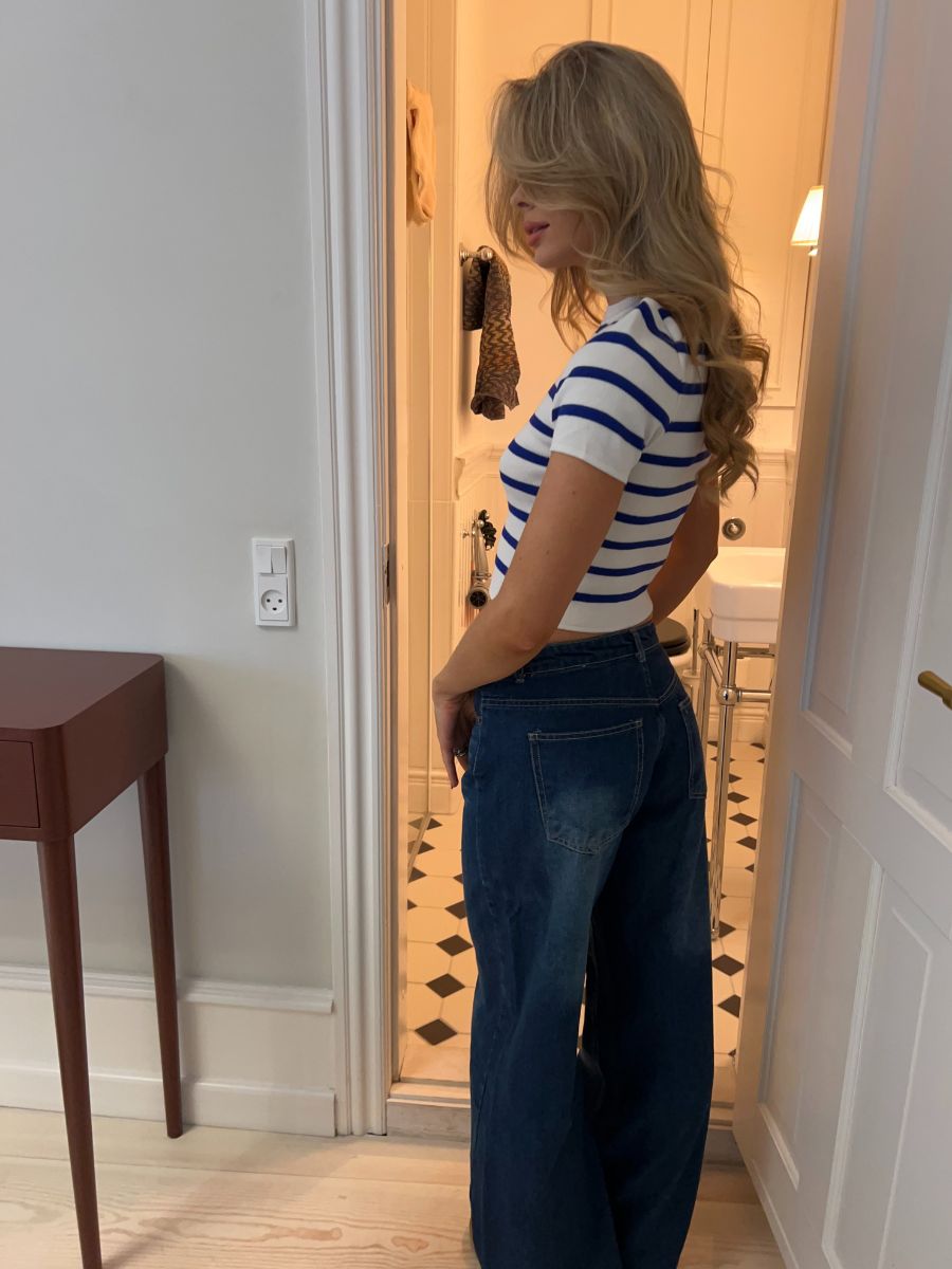 The Asta T-shirt is the perfect addition to your wardrobe. It comes in white with blue stripes, is slightly cropped, and can easily be styled with a pair of shorts, a skirt, or a pair of pants—our Sally pants are especially perfect for this 💙