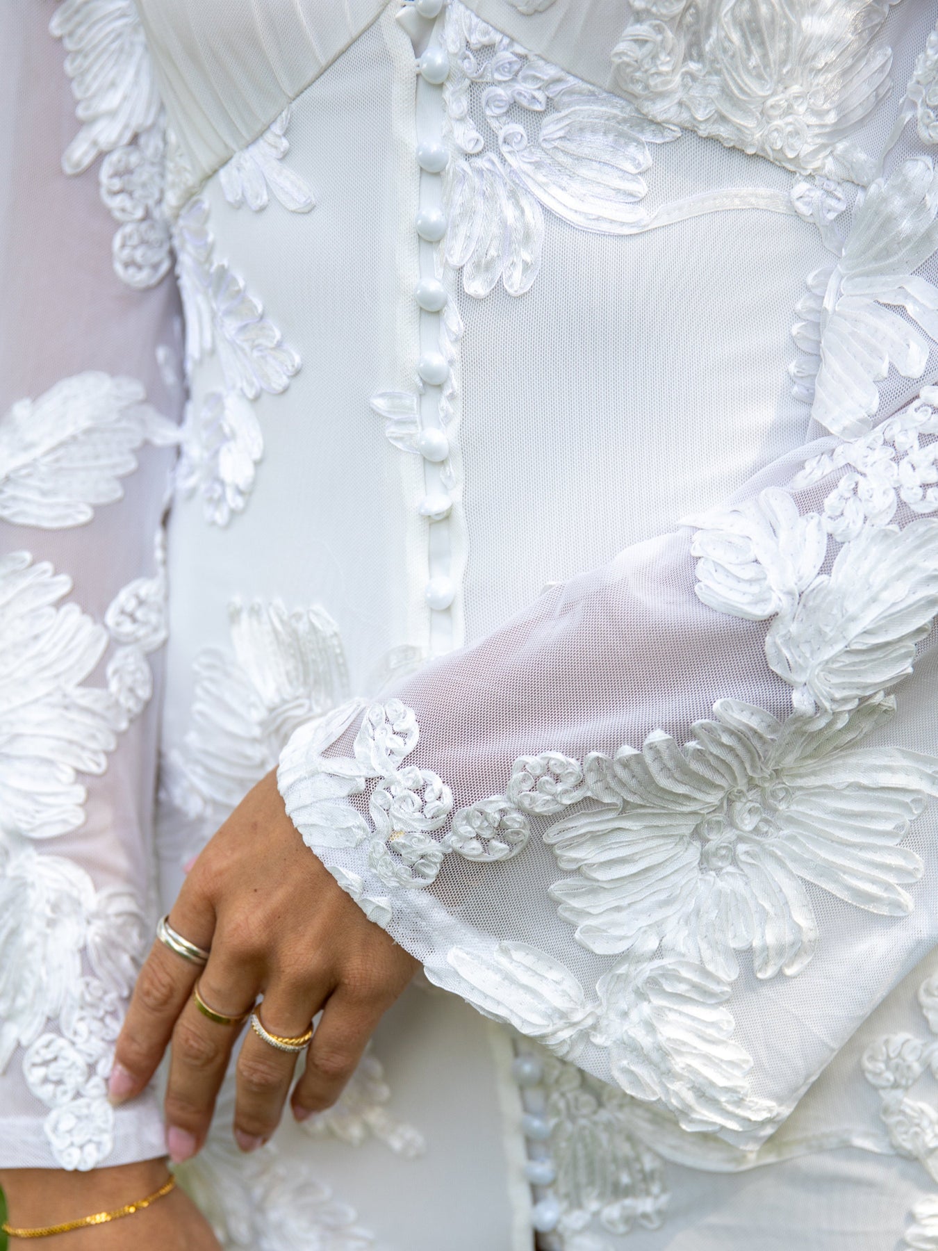 The Aurora Mini Dress in white mesh is both light and feminine with its beautiful V-neckline, delicate front buttons, and elegant floral embroidery that adds a romantic touch. A perfect dress for sunny days, summer parties, or a night out.