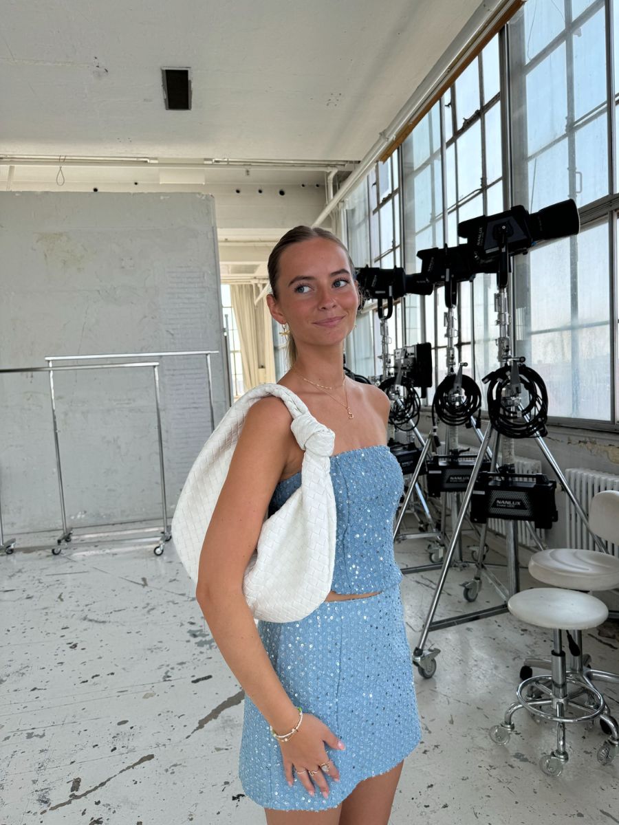 The set consists of a feminine mini skirt and a modern bandeau top, both made from classic denim material with a glamorous twist, thanks to the many attached sequins. Both pieces are form-fitting with a zipper at the back, ensuring a perfect and comfortable fit 💙
