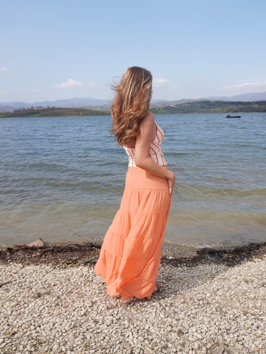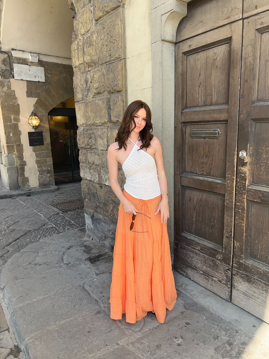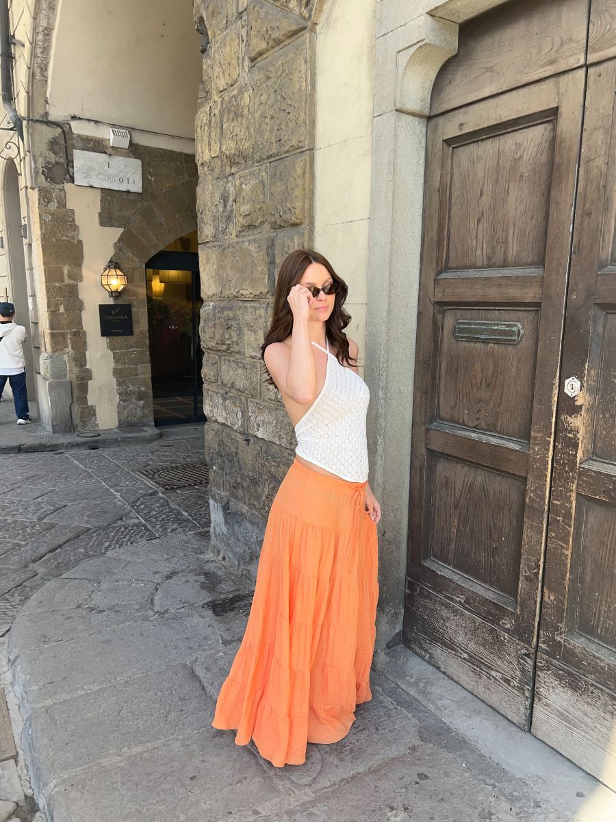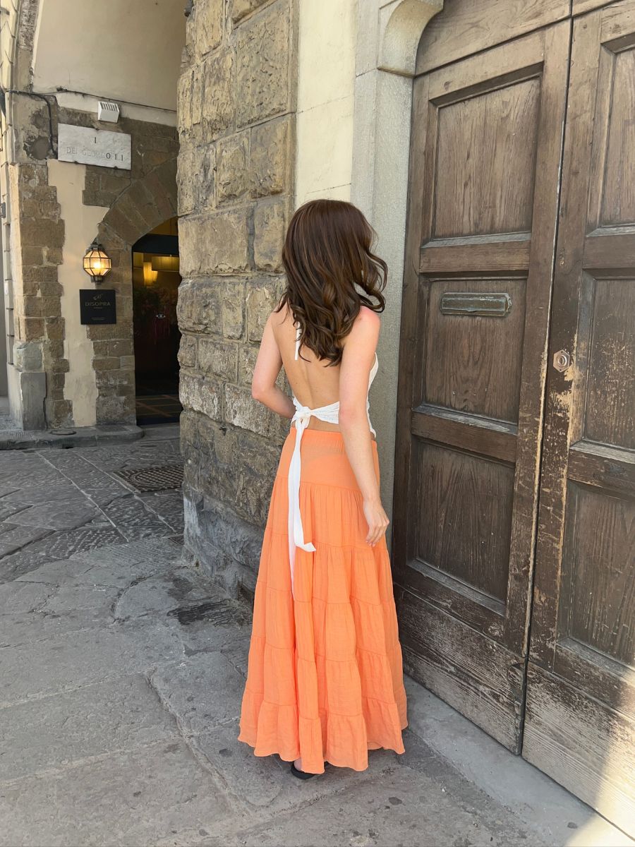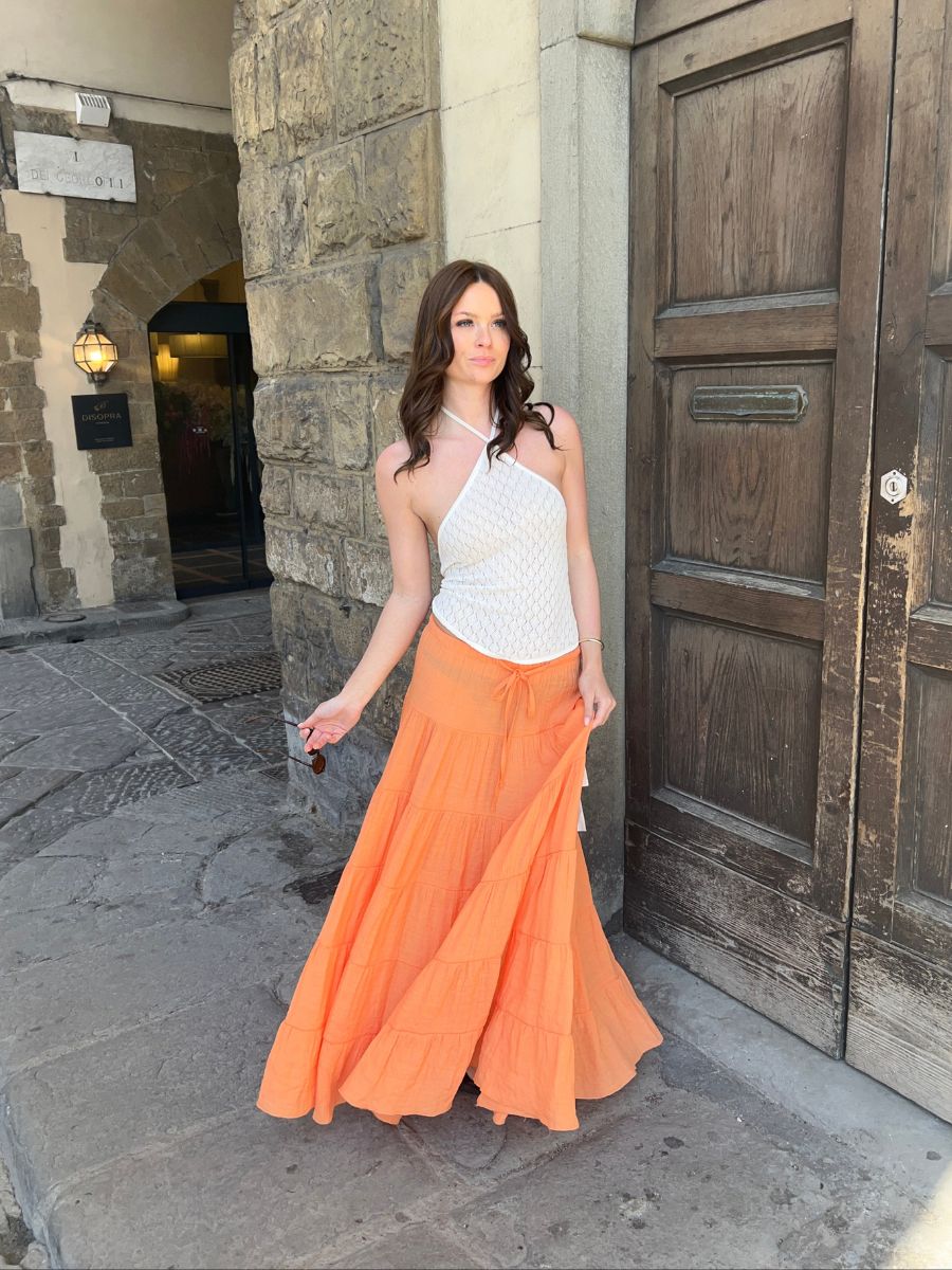 Loose and airy maxi skirt in bright orange, perfect for hot summer days. It is sewn in a thin summer fabric that feels light and comfortable against the skin - but be aware that the material may appear slightly transparent in certain lighting conditions. The fresh color and airy design make it ideal for holidays, the beach or a sunny city break.