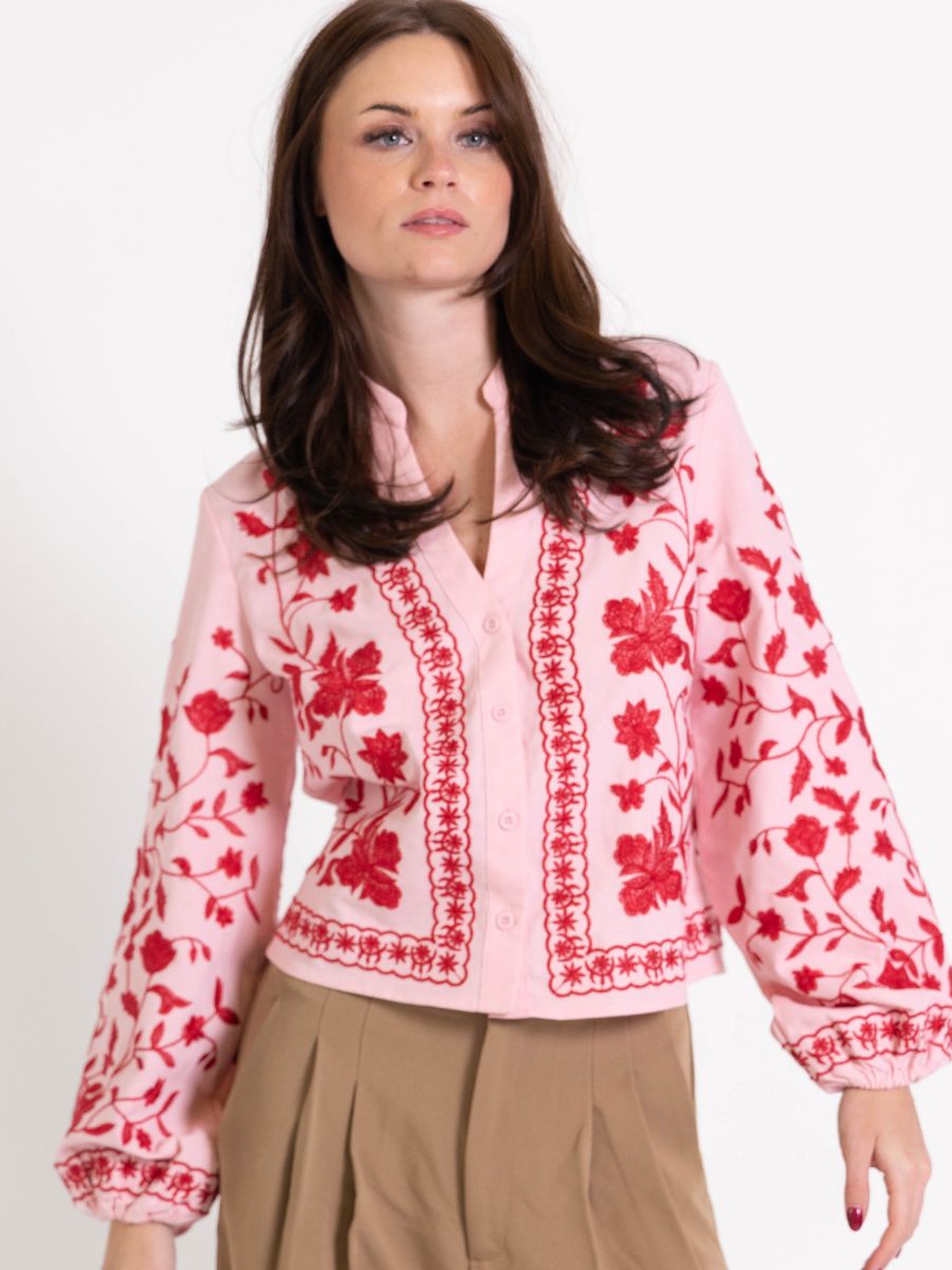 Our lovely Emma shirt with balloon sleeves comes in a light pink/pink base with red embroidery. The shirt has a button closure at the front but can also be styled as a cardigan when worn open 💖