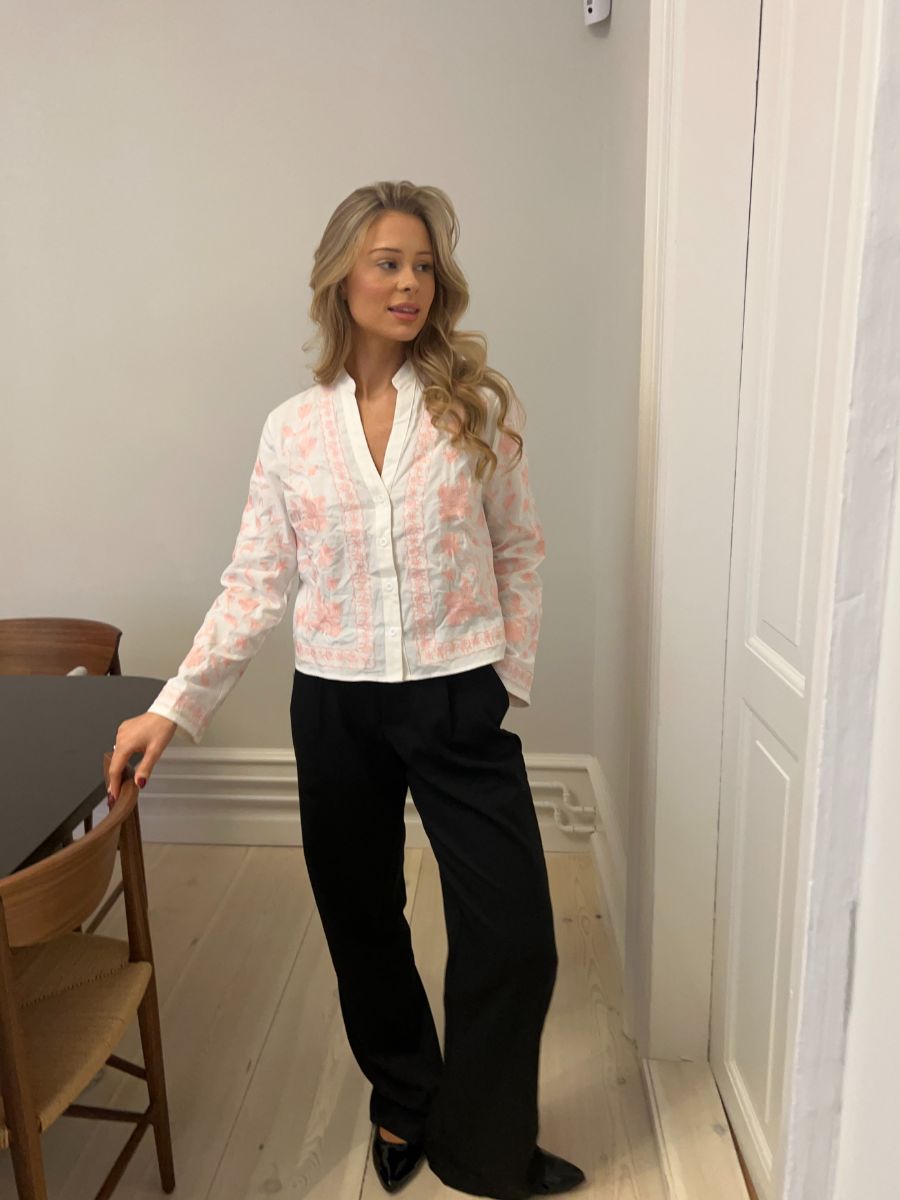 Our elegant Emma shirt – the perfect addition to your wardrobe! With its white base and delicate pink details, it's suitable for both everyday outfits and more formal occasions. It fits any occasion and can be styled with either a skirt or a pair of trousers 🤍