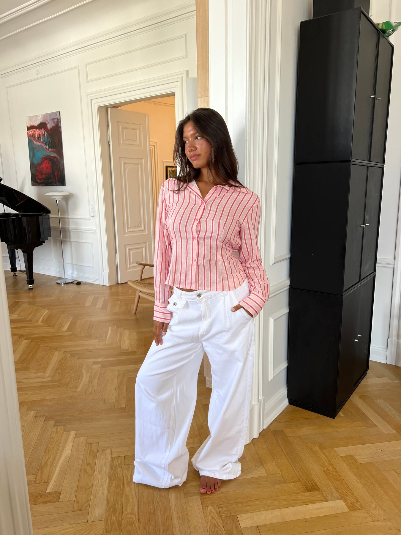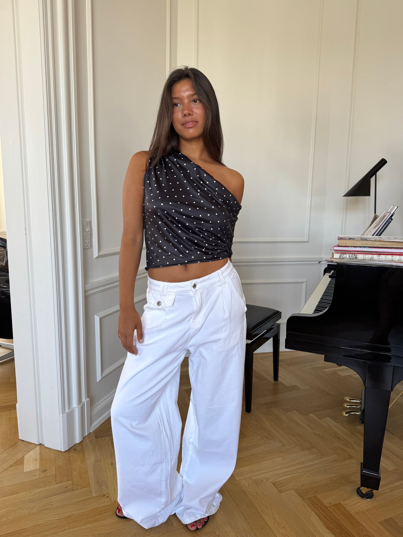Esme baggy jeans are for those who love a relaxed and cool look. They come in a baggy fit with unique details at the front, pleats at the sides, and a double belt loop that gives the pants a little extra edge. They have a zipper and button closure at the front and matching pockets, making them both practical and stylish. Perfect to style with a simple top or cropped tee for a light and elegant everyday outfit.