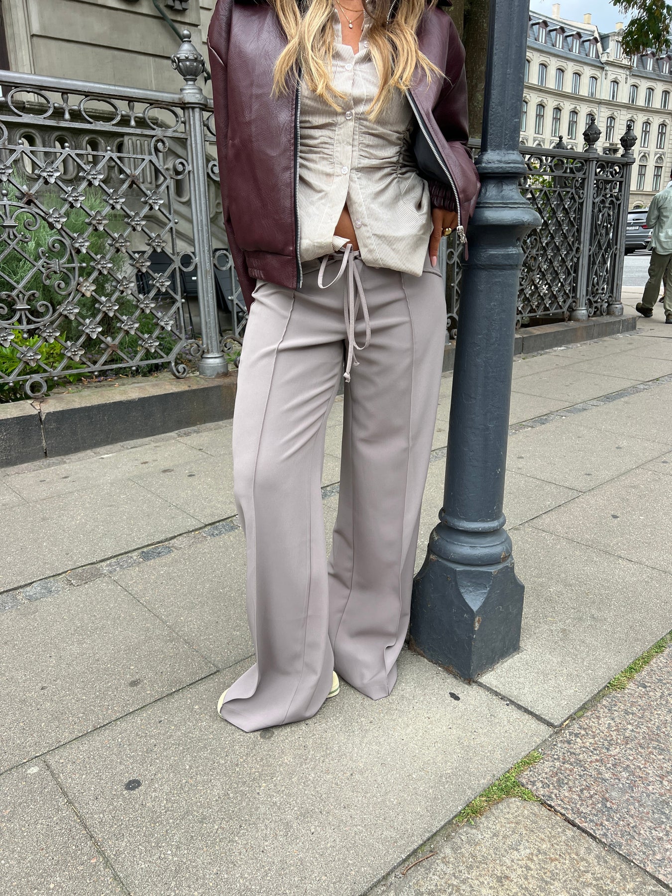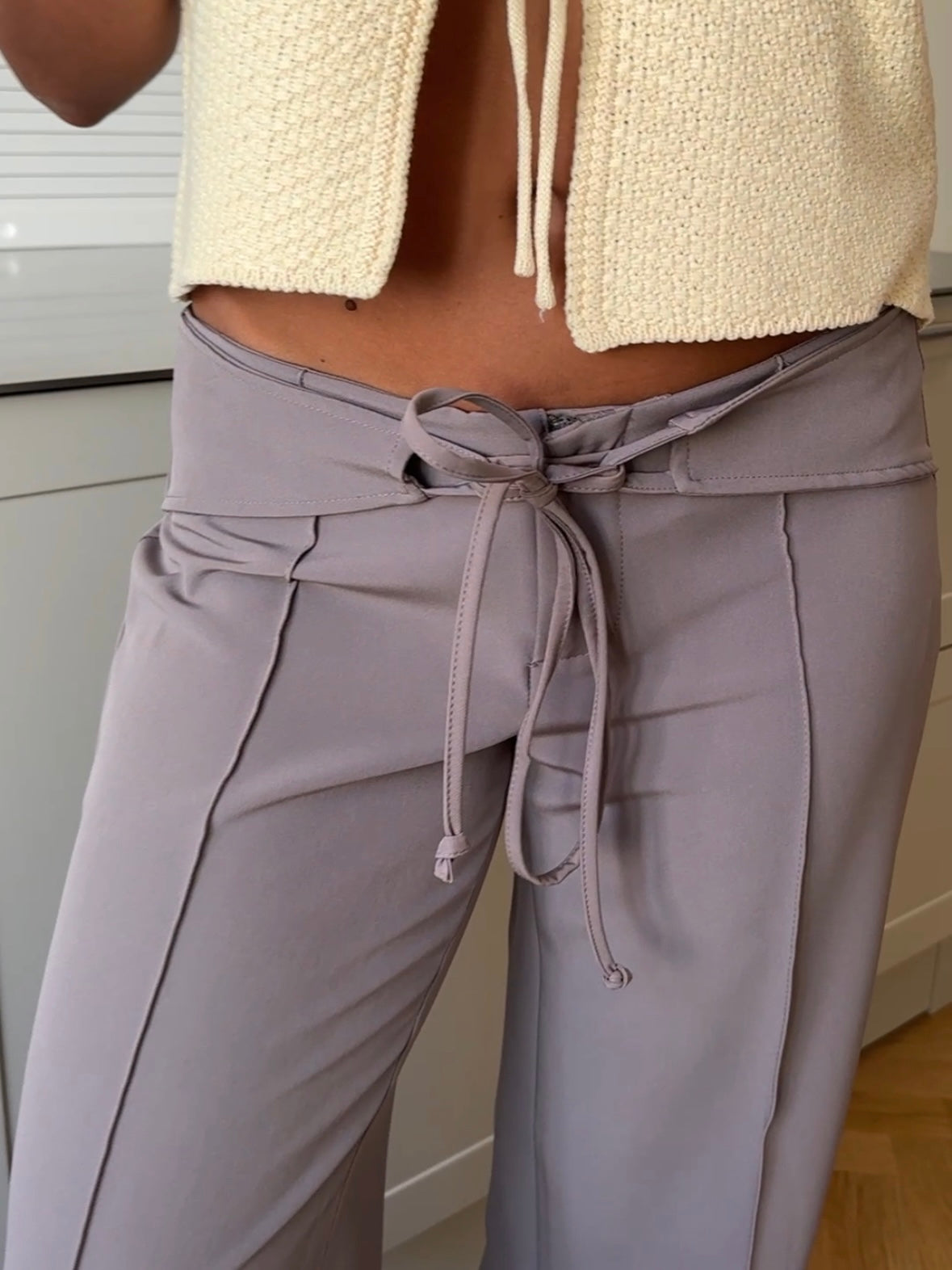Kaia low-waisted suit pants have a cool low-waisted fit and a wide tie waistband, which both provides a great fit and adds fine details to the look. The adjustable waistband makes them easy to customize and gives the pants a more unique and exclusive look. The lilac beige color gives a soft but stylish look – perfect for both everyday wear and when you want to dress up a little without overdoing it.