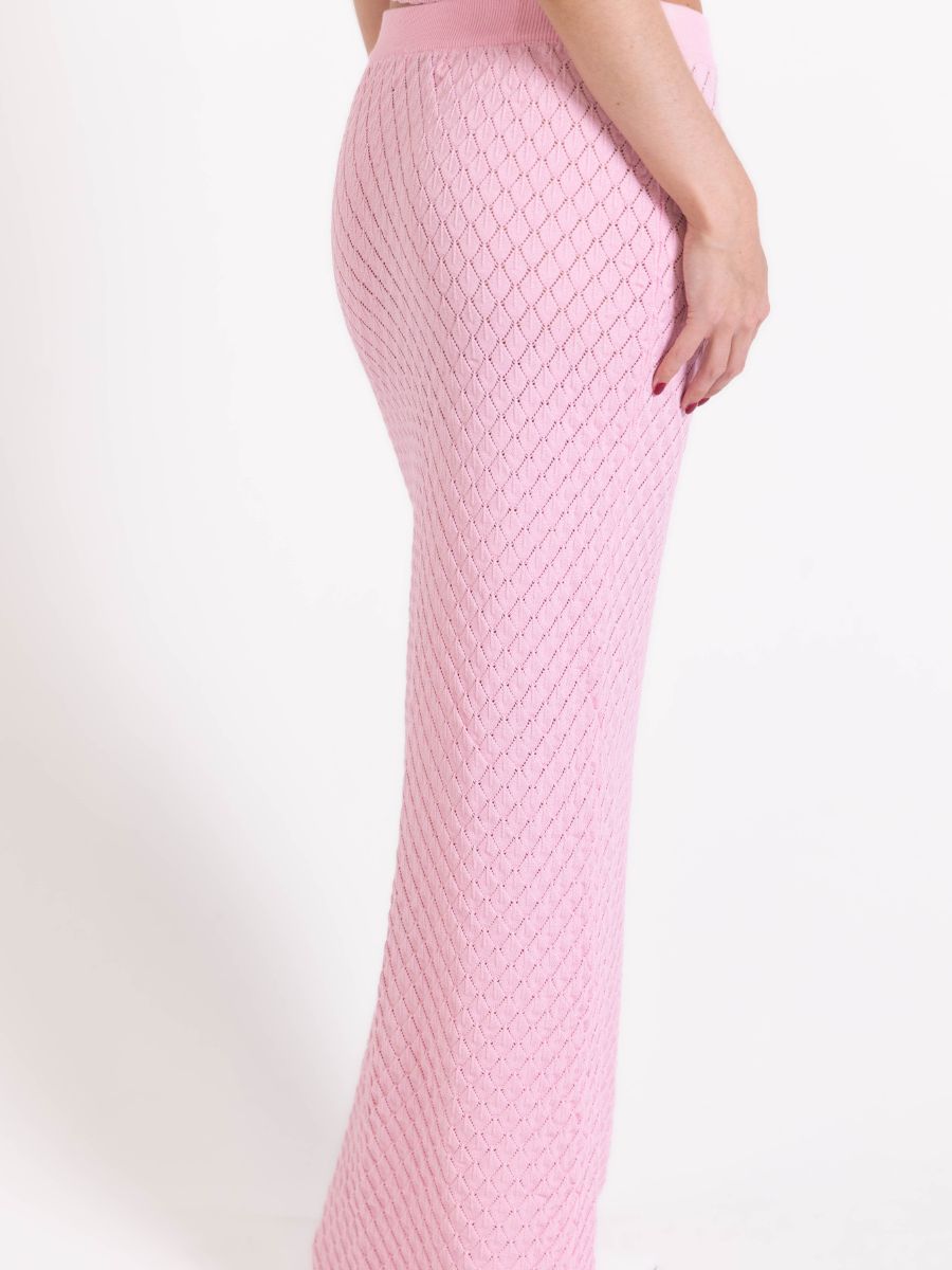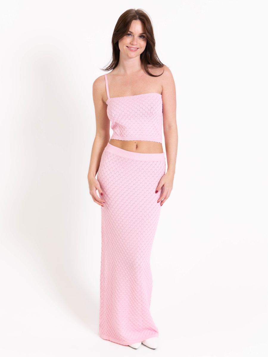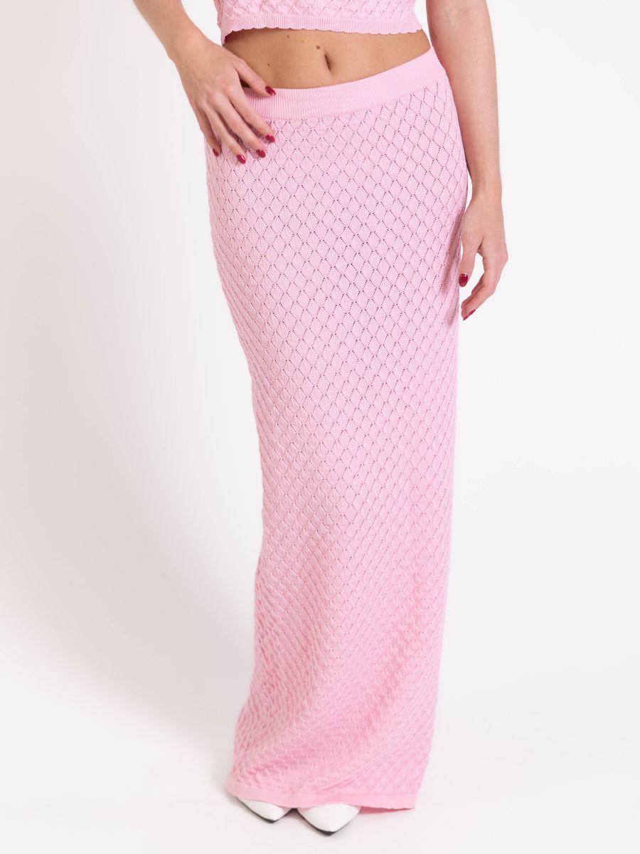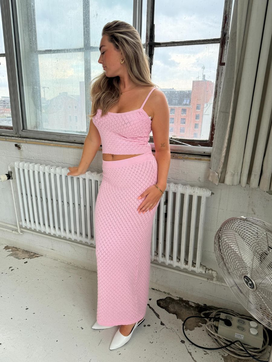 Maddy is a long knitted skirt with a beautiful pattern that adds texture and charm. It comes in a soft and delicate pink color that creates a summery vibe. The skirt can easily be styled on its own or with the matching top if you want a complete set. Perfect for both everyday wear and weekends when you want to be comfortable and cool.