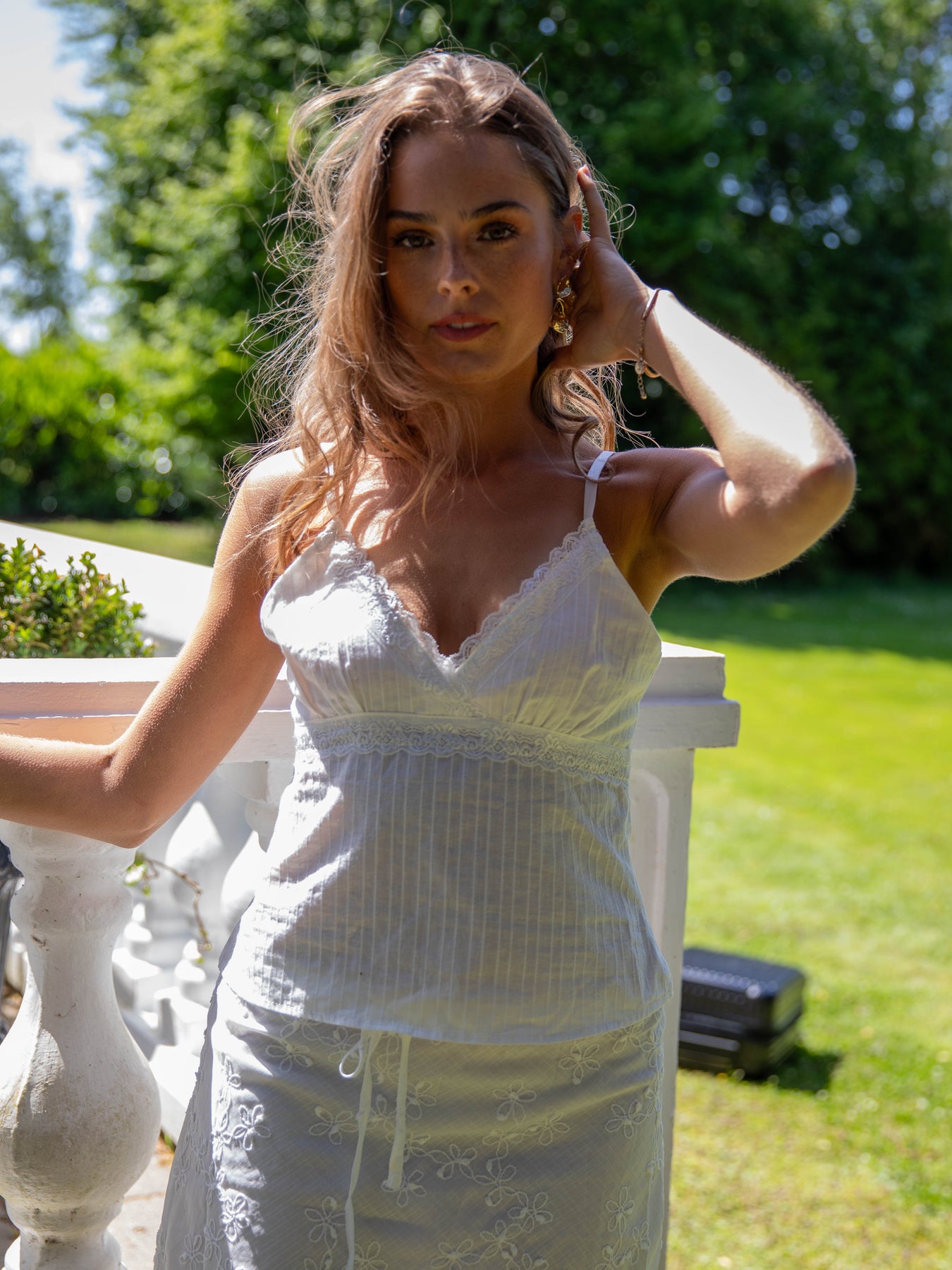 Nia strap top in the finest summery color. The top has adjustable straps and a flattering V-neckline with delicate lace details that add a feminine touch. The lightly textured fabric with fine vertical stripes gives an elegant look.
