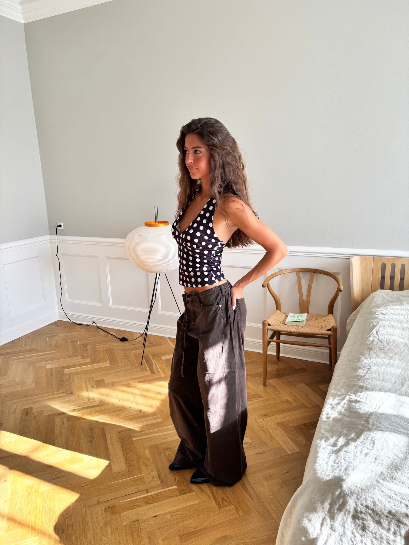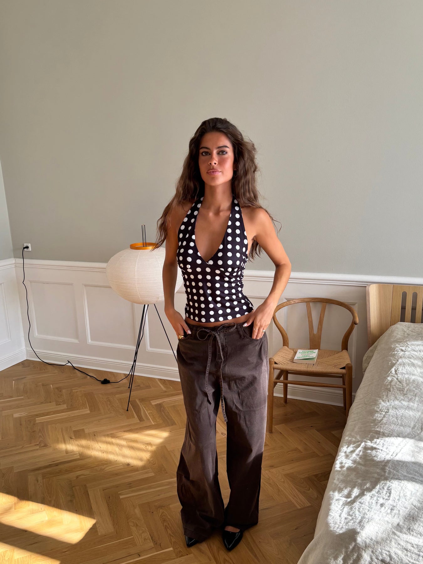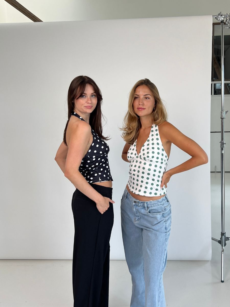 Our Ophelia top in black/white is a close-fitting, stretchy top with the finest white polka dots and a beautiful V-neckline that gives it a feminine look. It has a half-open back and fastens at the neck, adding a nice detail at the back. A versatile top that can easily be styled up or down – whether you're going to a party or just want to spice up your everyday look.