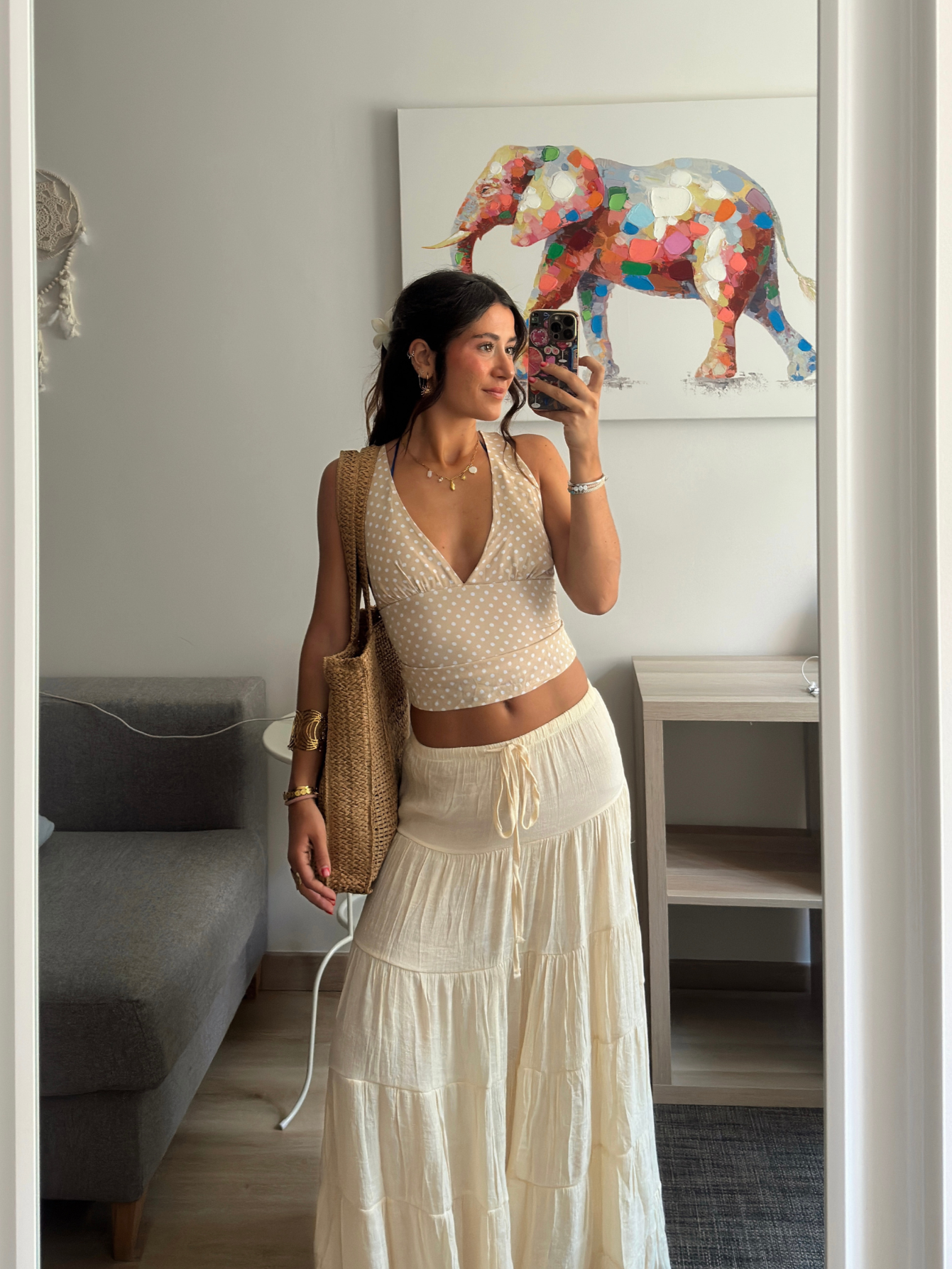 Our Vida polka dot top in beige is a feminine and figure-hugging top with white polka dots and a beautiful V-neckline that accentuates the waist and creates a flattering silhouette. The top has an open back and ties with delicate strings at the neck and lower back, adding an elegant and feminine detail. Perfect for both everyday wear and parties – style it with everything from jeans to a skirt for a look that stands out.