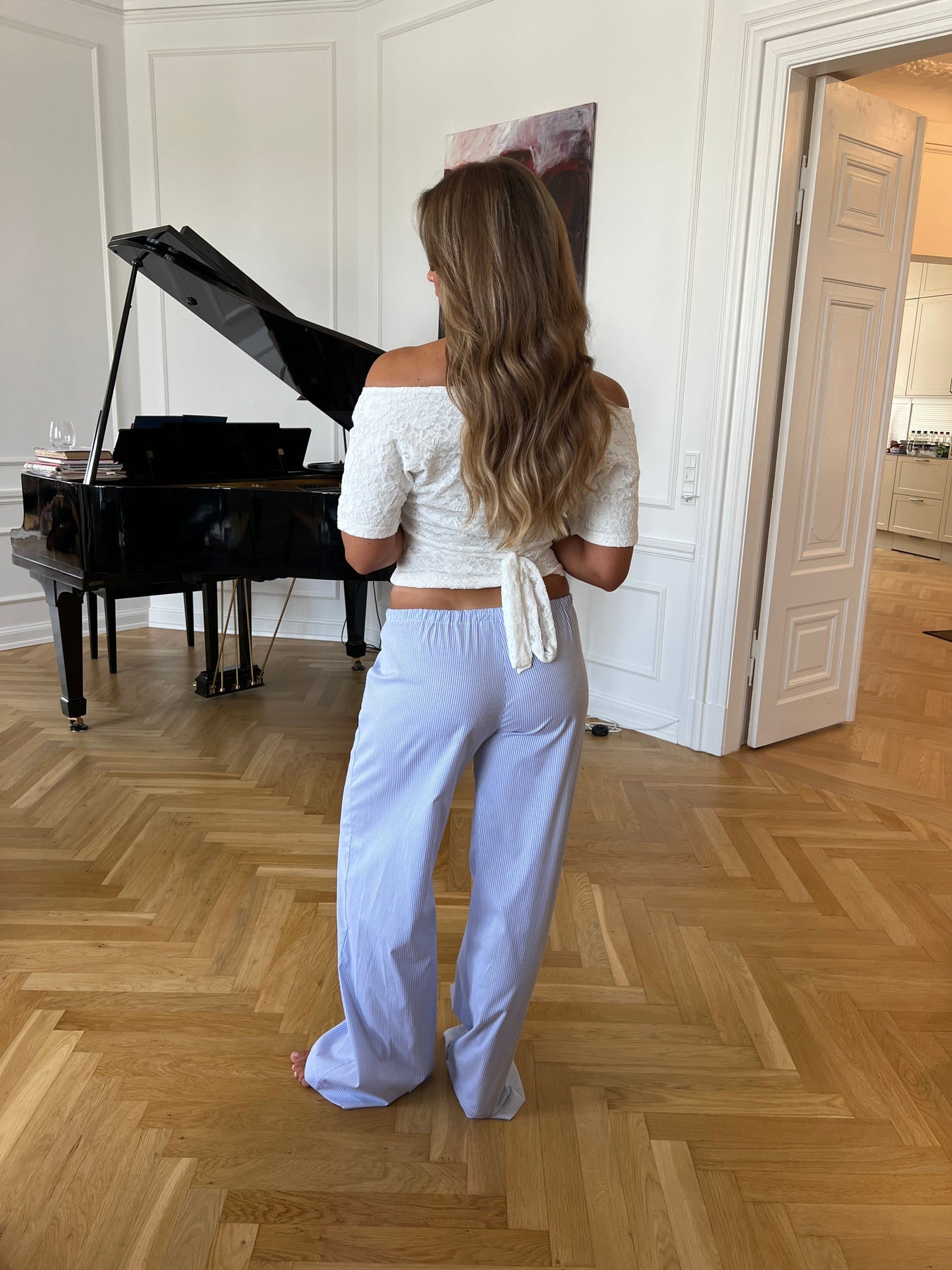 Our low-waisted Vita pants have a cool yet relaxed look. The pants have a low-waisted fit with a drawstring at the waist, which allows for easy and flexible styling—whether with cropped tops, loose shirts, or an oversized tee. The white and blue stripes, together with the low waist, give any outfit an edge and make them suitable for both everyday wear and a cute summer look.